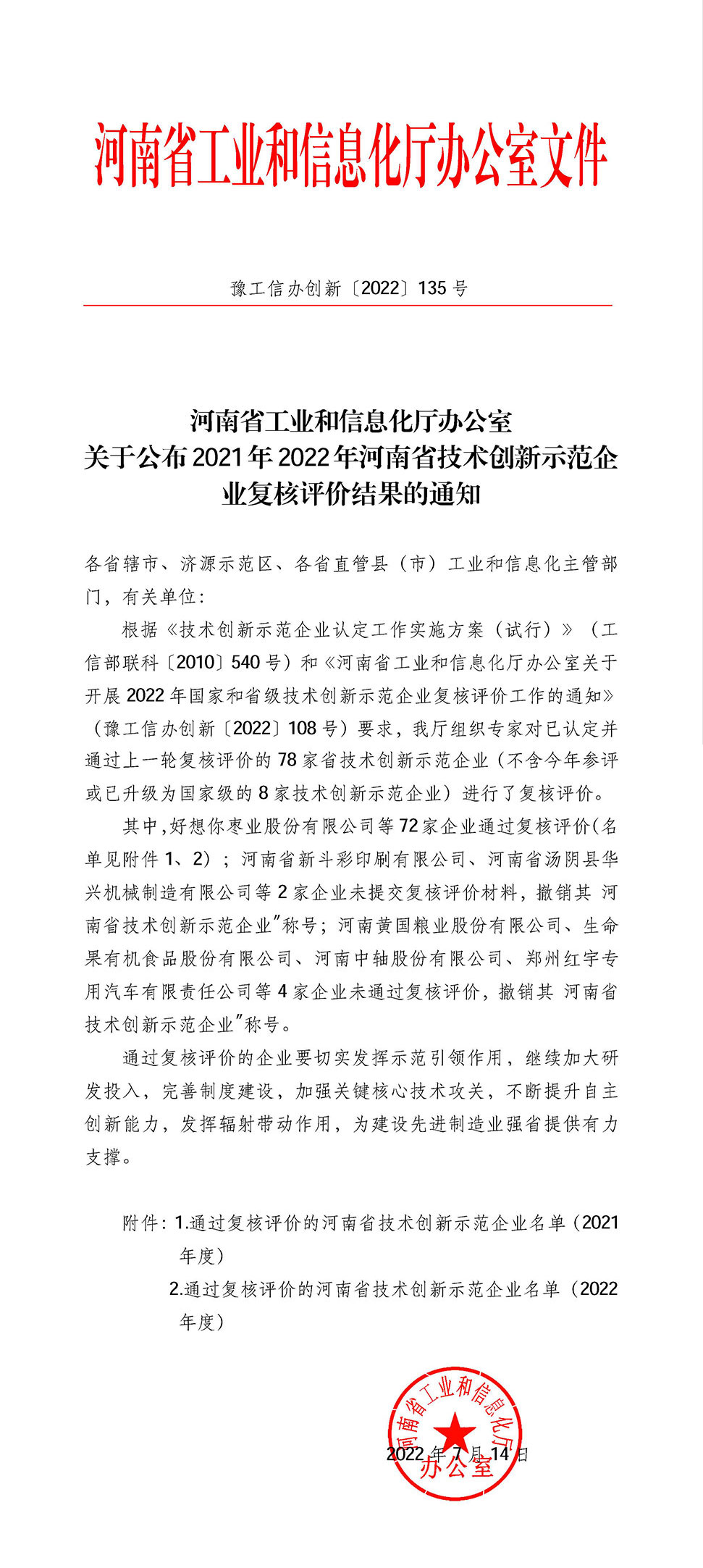 7月14日,河南省工业和信息化厅办公室公布《关于公布2021年2022年河南省技术创新示范企业复核评价结果的通知》,我公司成功通过2022年复核评价。