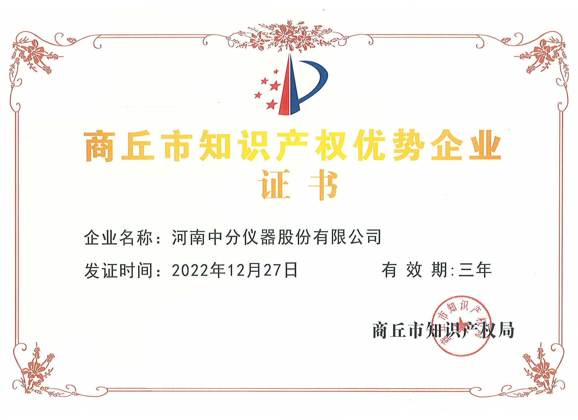 近日,我公司荣获由商丘市知识产权局颁发的商丘市知识产权优势企业证书,这项殊荣进一步证明了我公司在知识产权领域不俗的表现。